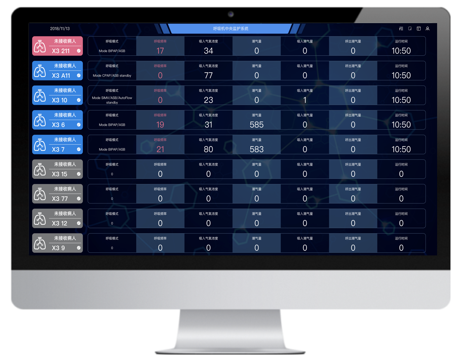 通過的最新的數(shù)據(jù)采集技術(shù)和網(wǎng)絡(luò)技術(shù)將多臺不同品牌的有創(chuàng)呼吸機(jī)聯(lián)網(wǎng),并通過大屏實(shí)時集中呈現(xiàn)治療預(yù)設(shè)參數(shù)和監(jiān)測參數(shù),實(shí)現(xiàn)多臺集中監(jiān)測、集中管理和數(shù)據(jù)存儲。
